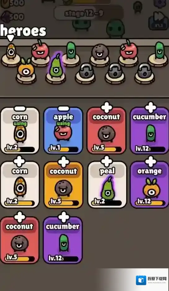 2、点击下方的英雄按钮可以召唤不同的水果,召唤后你可以选择上阵或者用来强化其他水果。
